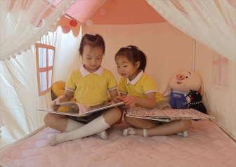 淘来的好书,或自由翻阅,或讲给好朋友听,孩子们三五伙伴或坐或趴,帐篷里、软垫上,享受着春日美好时光,开启了一段美妙的“悦”读之旅~。